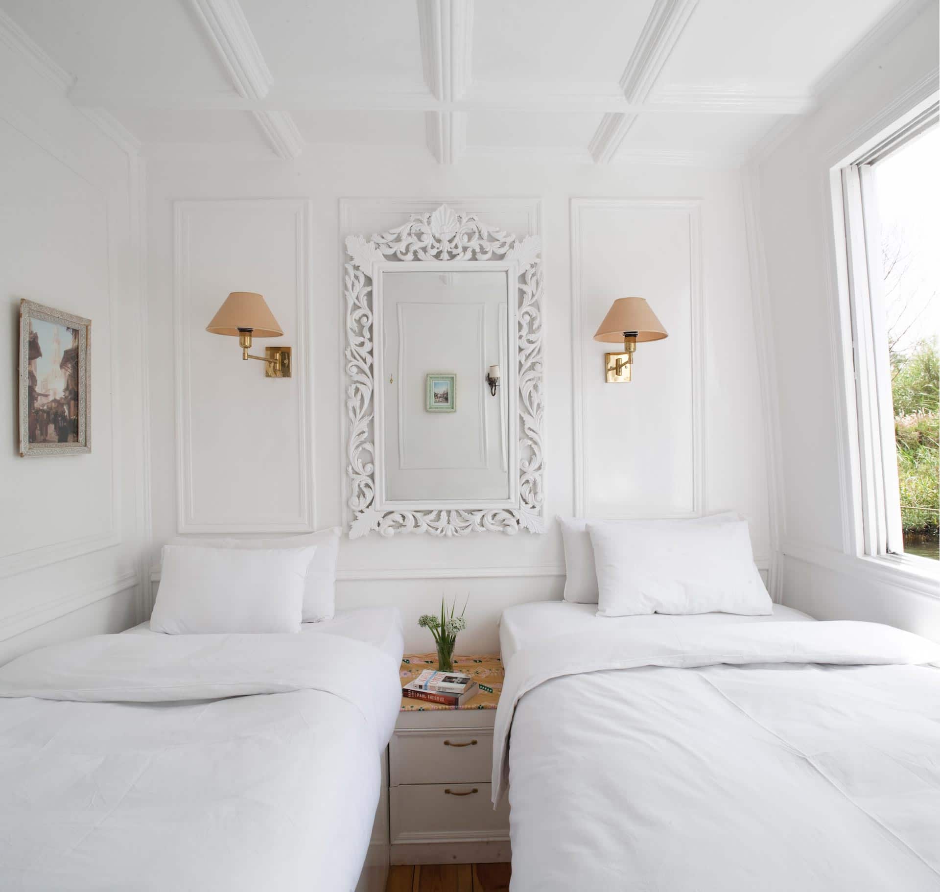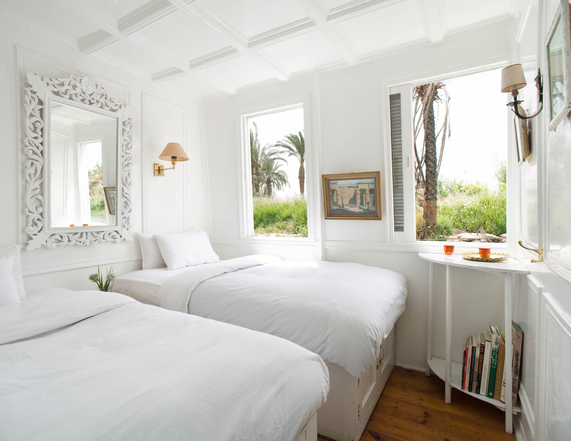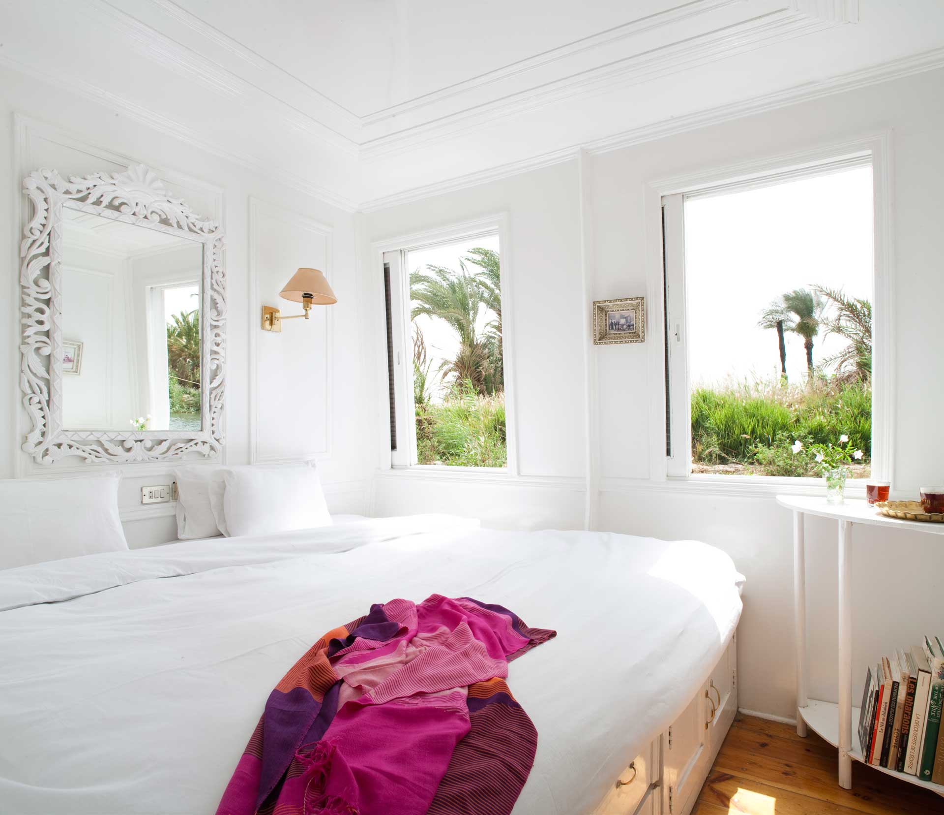 While considerably smaller than our panoramic “suites,” the two Panoramic Rooms” still offer elegance and light. With floor-to-ceiling windows that offer expansive views of the river and with a king-size bed, the panoramic suites provide an opportunity to cruise in grand style. The en-suite includes a shower, toilet, and wall-to-wall mirrors. The coziest of Nour El Nil’s rooms, Assouan Dahabiya Nile Cruise cabins can be configured with kingsize or twin beds, have large windows offering extensive views of the Nile, reading lights beside the bed, and ample storage. The en-suite includes a shower, toilet, and wall-to-wall mirrors.