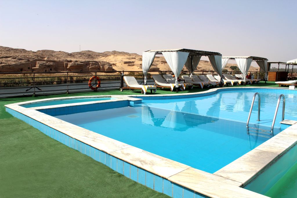 Nile cruise on MS Nile Dolphin has a “quiet area” next to the lounge with a panoramic balcony. It also has a bar, jacuzzi, sun deck, swimming pool—business center with internet access, boutique, and gift shop, all on a cruise. MS Nile Dolphin Cruise offers luxurious accommodations. It is for both tourists and business trips with a bonus.