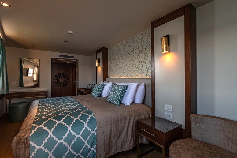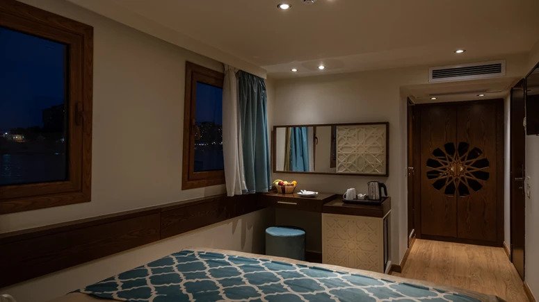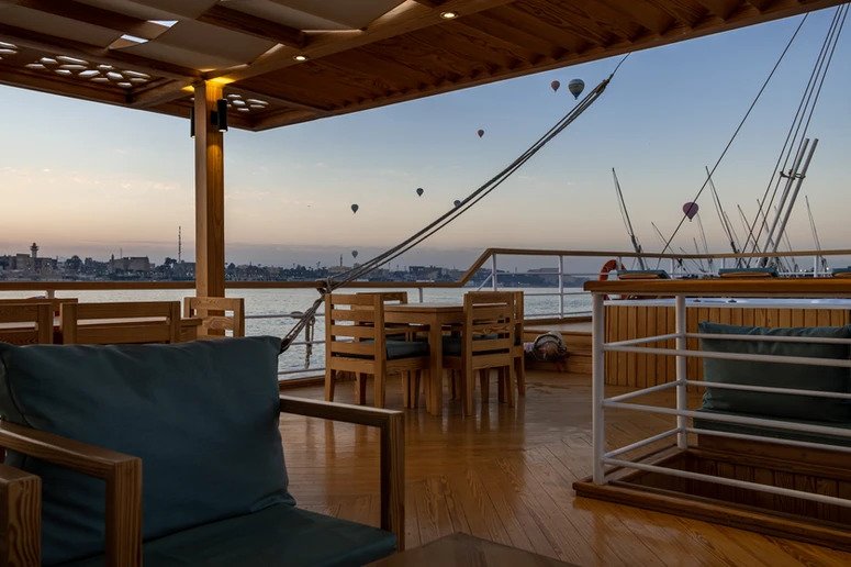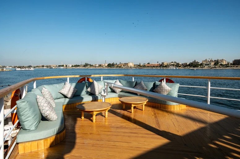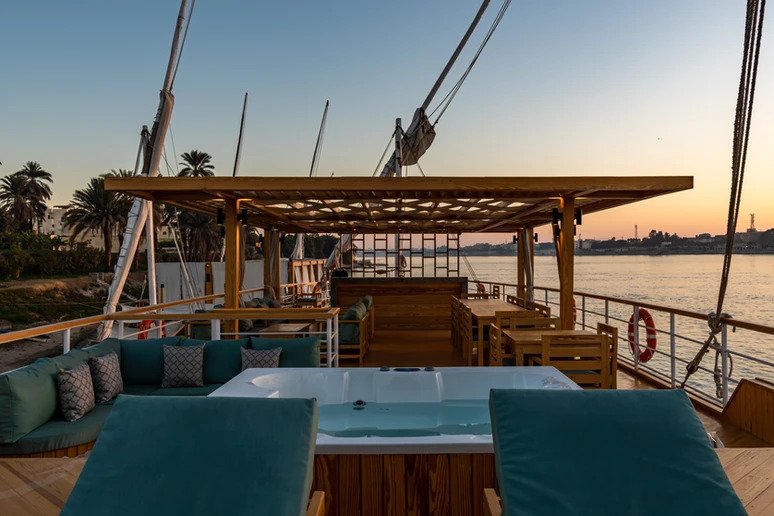 Sandrine Nile Dahabiya was a ship used by pharaohs and sultans to travel down the Nile. It was made to carry famous people and royalty, and its name is still used for the most expensive boats today. Because it moves slowly, it lets you see and appreciate this fascinating country’s beautiful places. You’ll visit temples and legendary places, learn about Egyptian culture and history, and find secret islands and small villages. From the ship’s terrace, you can admire the beauty of the Nile banks. Between trips to ancient Egyptian sites and relics, you can enjoy the modernity of the Arabesque dahabiya. Whether you’re relaxing in the sundeck jacuzzi, enjoying the peace of your private and luxurious cabin, or getting pampered by our 5 Star staff, you’ll go home with a total dose of R&R and memories of Ancient Egyptian history and beautiful sites.